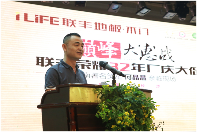 在一陣激情飛揚(yáng)、鼓掌整天的水鼓舞后,大惠戰(zhàn)正式拉開(kāi)帷幕。聯(lián)豐木業(yè)董事長(zhǎng)沈建新先生首先致歡迎致辭,鄭重承諾:一、本次活動(dòng)力度之大前所未有,全場(chǎng)均為工廠直供價(jià),全年保價(jià)。二、聯(lián)豐作為中國(guó)實(shí)木地板之父,亞洲品牌500強(qiáng),中國(guó)地板十大品牌,中國(guó)環(huán)保地板品牌等行業(yè)頂尖榮譽(yù)的獲得者,本次活動(dòng)銷(xiāo)售的所有產(chǎn)品均符合及優(yōu)于國(guó)家標(biāo)準(zhǔn)。三、本次“巔峰大惠戰(zhàn)—聯(lián)豐榮耀32年廠慶”大促僅限今天到現(xiàn)場(chǎng)的客戶(hù)予以享受工廠直供優(yōu)惠及超值服務(wù)。選擇聯(lián)豐就是選擇實(shí)惠,選擇聯(lián)豐就是選擇健康!希望位業(yè)主朋友滿(mǎn)意而來(lái),滿(mǎn)載而歸,感謝大家32年來(lái)對(duì)聯(lián)豐的支持與信任,預(yù)祝“巔峰大惠戰(zhàn)—聯(lián)豐榮耀32年廠慶”大促圓滿(mǎn)舉行!董事長(zhǎng)的承諾就是最大的強(qiáng)心劑,現(xiàn)場(chǎng)進(jìn)入白熱化搶購(gòu)階段。