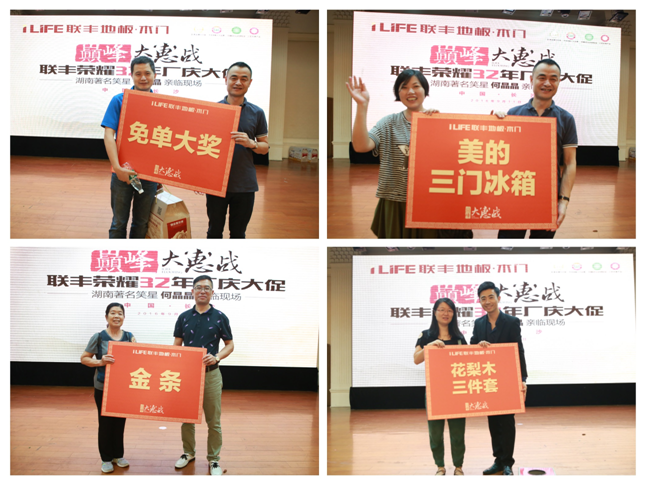 接著整點(diǎn)抽獎(jiǎng)環(huán)節(jié),驚喜送出近500份大禮——旺宅紅木大象、仿古實(shí)木椅、花梨木三件套、金條、美的三門(mén)冰箱、4999元免單大獎(jiǎng)都與現(xiàn)場(chǎng)的業(yè)主如約而至??偨?jīng)理李玉明在接受中華地板網(wǎng)記者采訪時(shí)表示,聯(lián)豐不僅要讓消費(fèi)者用最低的價(jià)格買(mǎi)到最好的聯(lián)豐產(chǎn)品,還要讓在場(chǎng)所有支持聯(lián)豐的朋友把終極的實(shí)惠帶回家。
