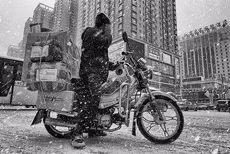 在城市的大街小巷中。寒冷的氣溫讓電瓶很容易沒電,道路濕滑影響著騎行安全,風大雪大,有時讓騎車的他們連眼睛都睜不開。