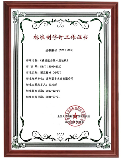 作為標準化示范企業(yè),聯豐一直對企業(yè)標準的制定極為重視,尤其在技術、服務、業(yè)態(tài)不斷更新迭代的當下,聯豐認為高標準的制定將極大地推進地板產業(yè)的高質量成長。在蓬勃發(fā)展的十多年里,聯豐用實際行動積極參與制定、修訂實木地板、強化地板、地采暖木質地板、高耐磨漆飾實木地板等國家標準,地采暖用實木地板鋪裝、驗收規(guī)范,負氧離子木地板等行業(yè)標準,為中國地板行業(yè)的標準化、制度化建設貢獻力量,推動行業(yè)高質量發(fā)展。