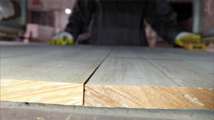 進(jìn)入廠區(qū)的原木坯料,需經(jīng)過(guò)為期180天以上的自然養(yǎng)生,再經(jīng)由光照、多人工片檢等方式對(duì)外觀進(jìn)行預(yù)檢。那些有蟲(chóng)眼節(jié)疤、開(kāi)裂、雙色、側(cè)彎等瑕疵的坯料都將被剔除出去,淘汰率高達(dá)30%以上,每一片被留下來(lái)的地板都是顏值扛把子。