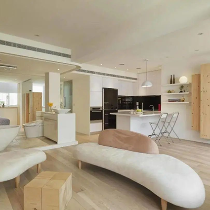 木紋婉轉,凹凸的拉絲手感,削弱了簡約風的寡淡,簡單純粹又吸睛,帶給人賞心悅目的體驗,讓人感到溫暖和振奮,也為空間注入了活力與暖意。
