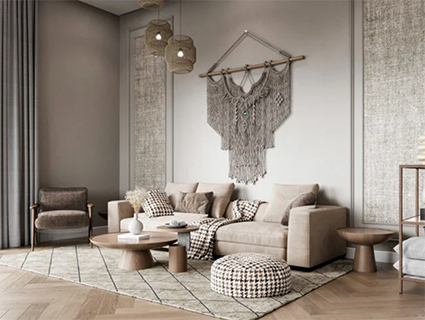 03自然性:波西米亞裝修風格強調手工藝和自然元素的融入,包括手工編織的地毯、墻掛、織物和飾品等,以及綠植、藤編、木制家具等自然元素。這些元素可以營造出自然、舒適的氛圍,并強調個性和獨特的藝術品味。