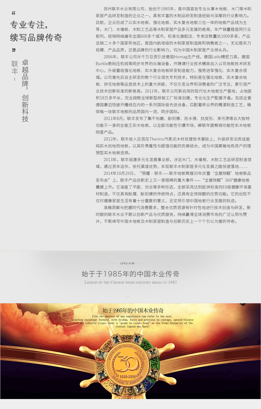 蘇州聯(lián)豐木業(yè)有限公司,始創(chuàng)于1985年,是中國最早專業(yè)從事木地板、木門等木制家居產(chǎn)品研發(fā)制造的企業(yè)之一,具有豐富的木制品研發(fā)制造經(jīng)驗與深厚的行業(yè)影響力。目前,企業(yè)形成了以實木地板、強化地板、實木復合地板三位一體的地板產(chǎn)品線為主導,木門、木墻板、木制工藝品等木制家居產(chǎn)品多元發(fā)展的格局,年產(chǎn)銷量穩(wěn)居同行業(yè)前列,經(jīng)銷網(wǎng)絡遍布全國600多個城市,標準化旗艦店、專賣店數(shù)量達1000多家,產(chǎn)品遠銷二十多個國家和地區(qū),是國內(nèi)最大的木制家居制造商和銷售商之一,無論是實力規(guī)模、產(chǎn)品品質(zhì),還是品牌的行業(yè)影響力,均處于中國木制家居產(chǎn)業(yè)領軍地位。