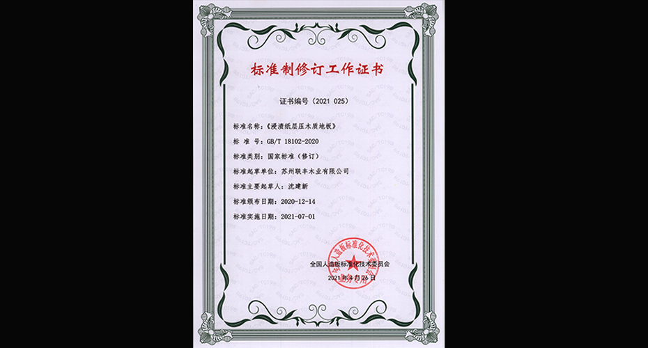 浸漬紙層壓木質(zhì)地板標(biāo)準(zhǔn)制修訂工作證書(shū)